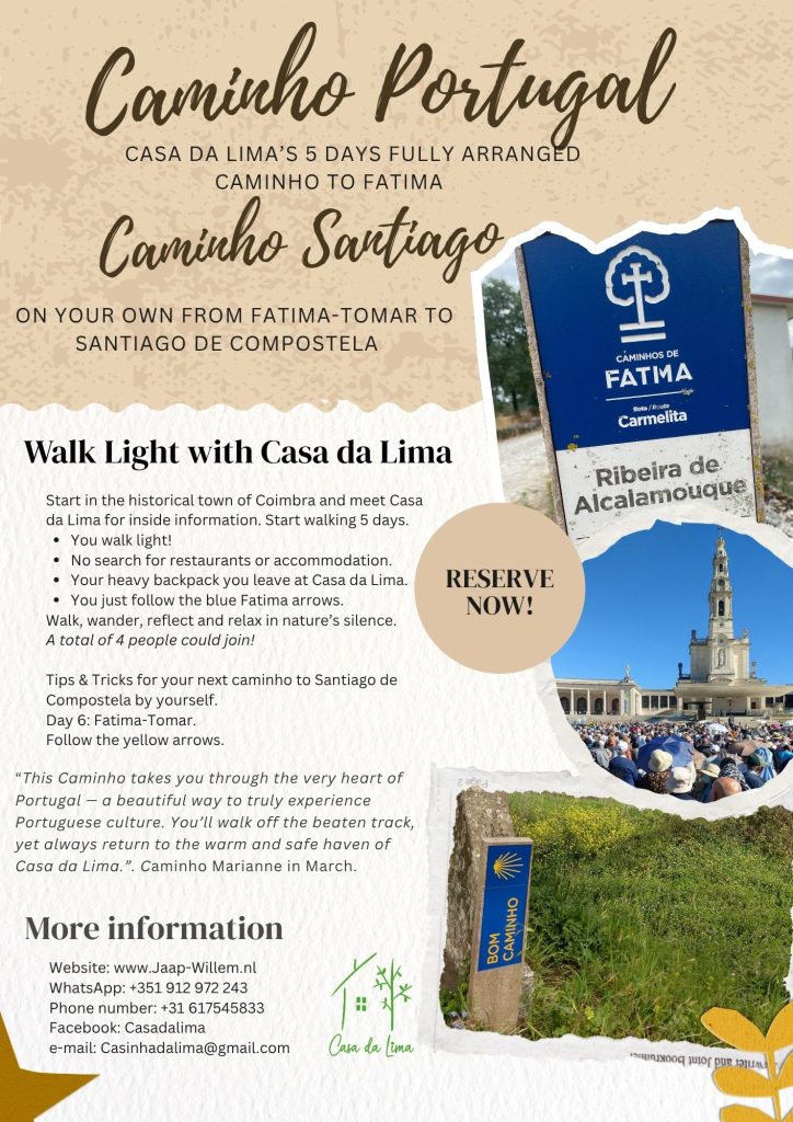 On your caminho from Coimbra- Condeixa to Fatima Casa da Lima will take care of you. Afterwards when you walk to Santiago de Compostela by yourself, you pass Casa da Lima again before moving on to Coimbra. We’d love to hear your experiences from Tomar to Casa da Lima!