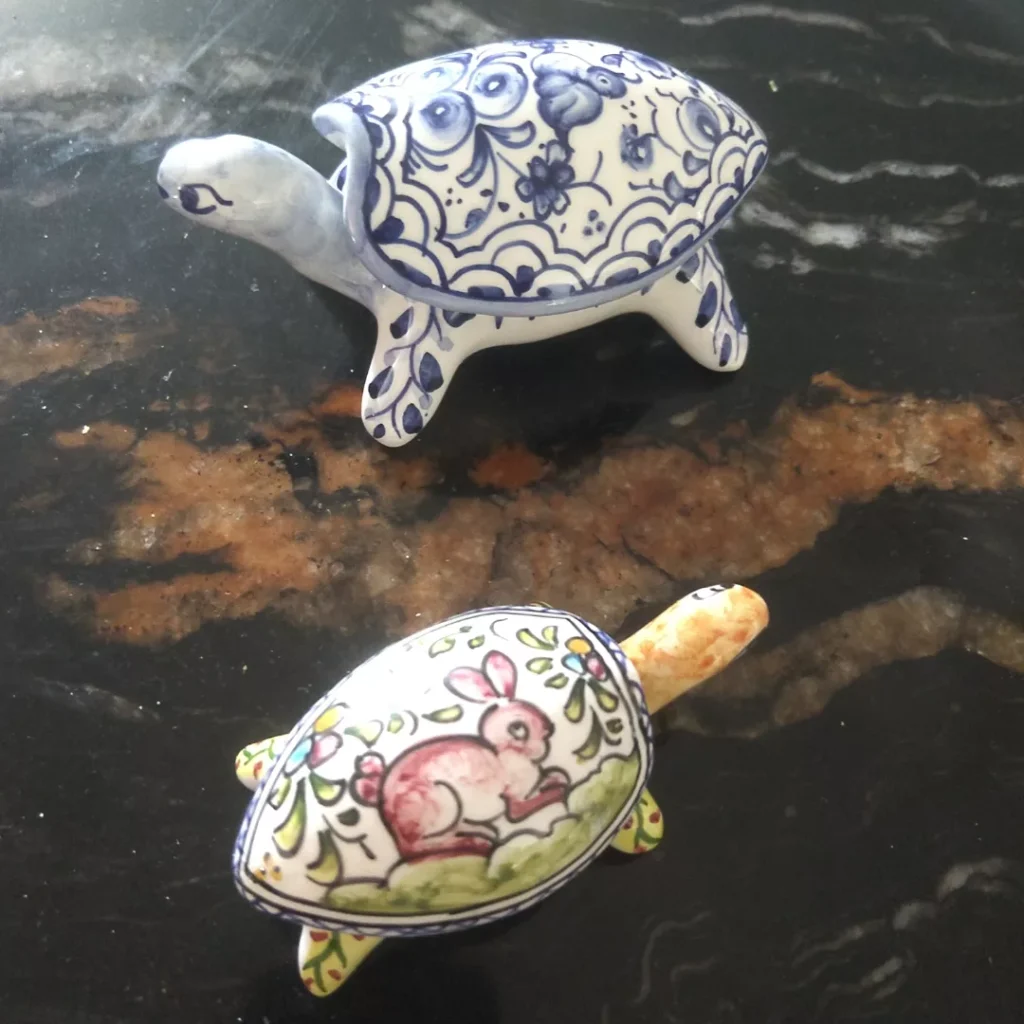 My friend the Chief Pilgrim gave me a shell before I walked the caminho. Inside he wrote: “A tartaruga é mais rápida que a lebre.” He once got this present from a restaurant owner when he was soaking wet resting outside the restaurant. When I saw this tartaruga, turtle handpainted on the souvenirs we offer you, I had to buy this particular one for future lebra, ‘hare’ pilgrims. You will cherish it more than all the other stuff in your backpack. It will set your caminho pace over and over again.