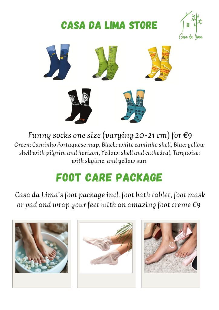 We have created a Casa da Lima store because guests asked for things and in time we got new ideas. Funny caminho socks, a feet retreat when you arrive, Jams for your bread on the way and spices to use while you cook on your caminho.